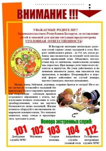 Уголовным кодексом Республики Беларусь за оставление детей без помощи в опасной для жизни ситуации предусмотрены арест или ограничение свободы (в соответствии со ст. 159 Уголовного кодекса Республики Беларусь).