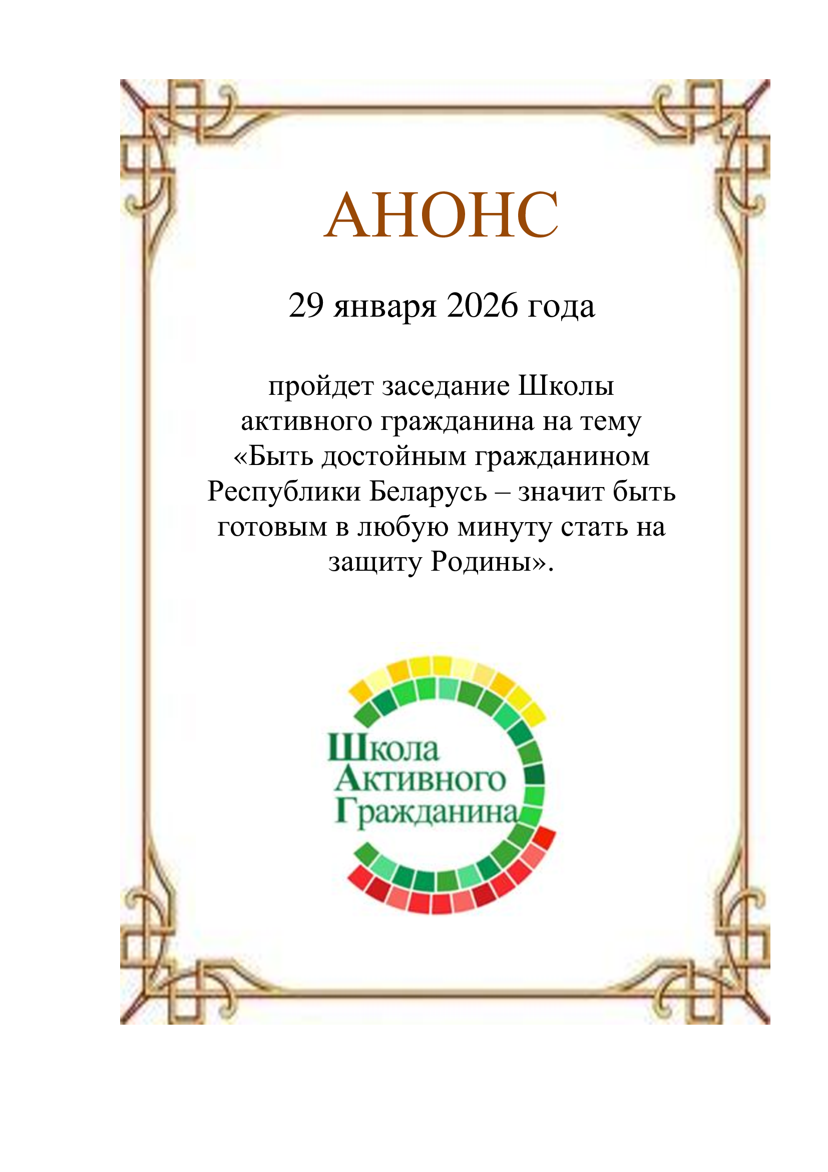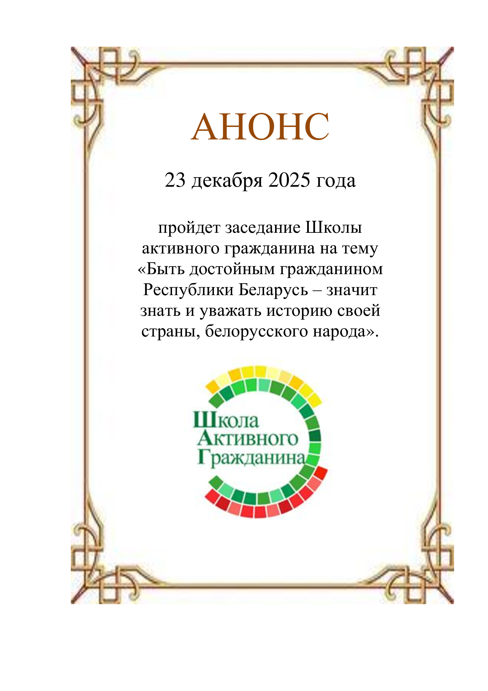 23 снежня 2025 г. адбылося чарговае пасяджэнне ў рамках школы актыўнага грамадзяніна па тэме “Быць дастойным грамадзянам Рэспублікі Беларусь – значыць ведаць і паважаць гісторыю сваёй краіны, беларускага народа”.